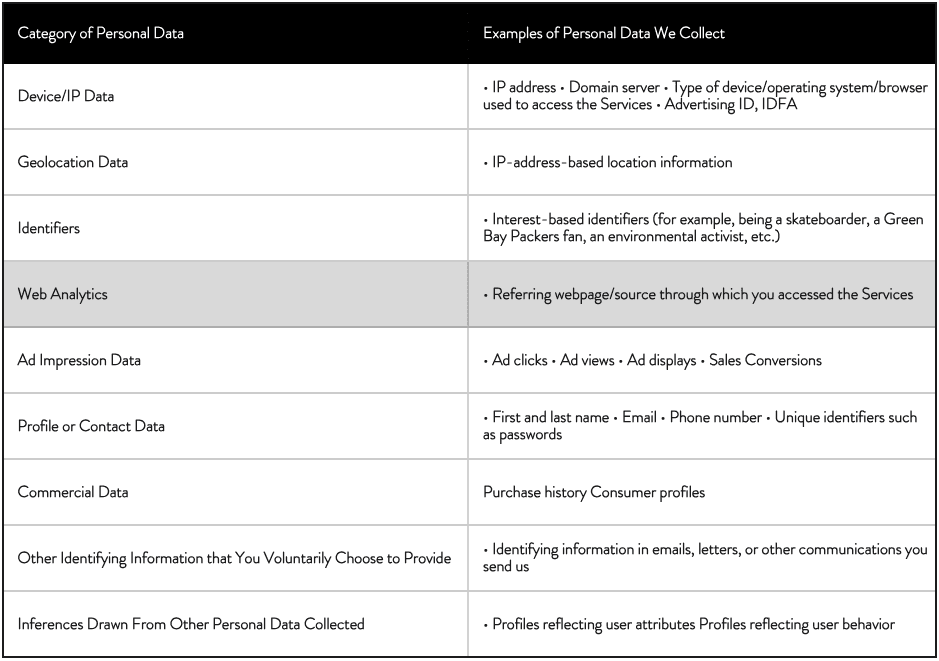 This chart details the categories of Personal Data that we collect and have collected over the past 12 months: